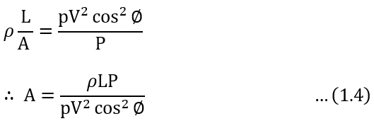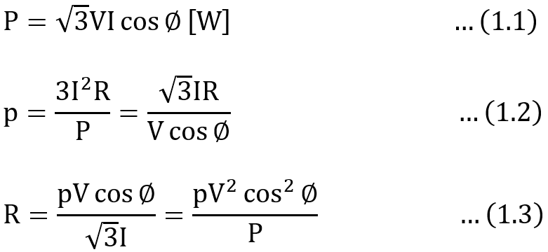 3상 선식 송전 선로에서 선간 전압을 선간 전압을 V [V], 선로 전류를 I [A], 역률을 cosφ, 송전 전력을 P [W], 송전 손실률은(소수)을 p, 송전 거리를 L [m], 전선 한 가닥의 저항을 R [Ω]이라고 하면