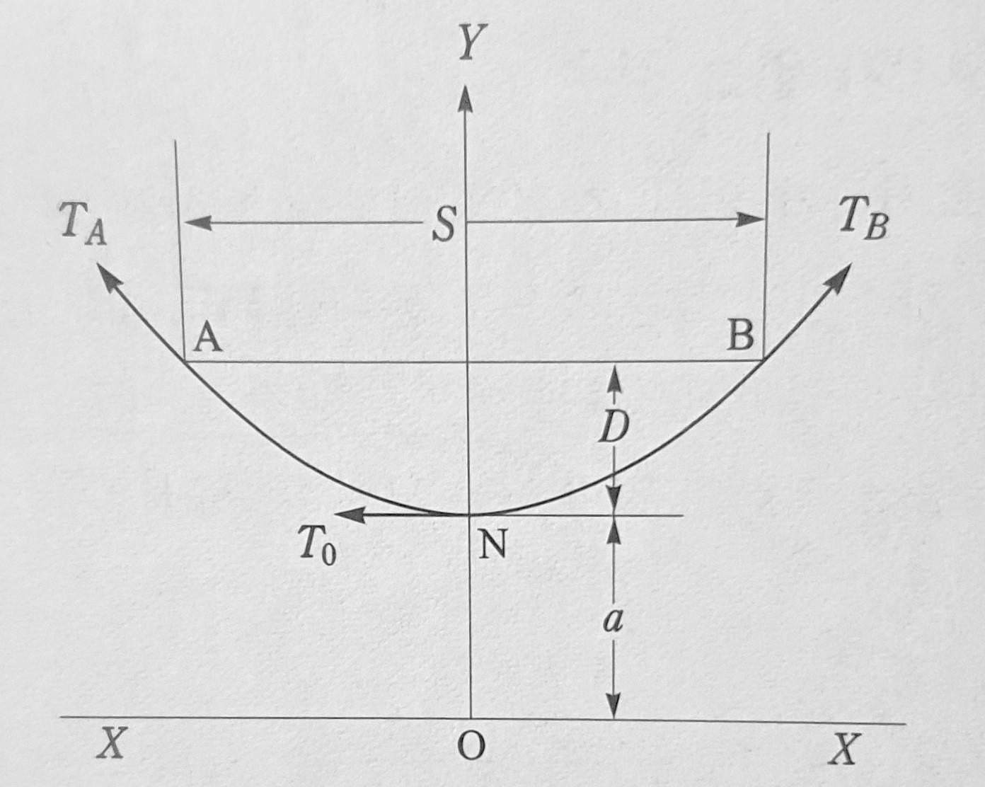 그림 2.4에서 전선의 지지점 A, B에 있어서의 장력을 Ta , Tb라고 하면 이경우 Ta = Tb = 최대장력으로서 최저점에서의 수평 장력 T₀에 전선 중량과 이도와의 곱을 더한 것과 같아진다.