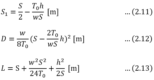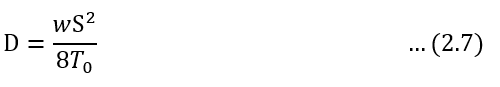 식 (2.7)은 경간이 S일 때의 전선의 이도 D를 계산하는 식으로서 D는 경간의 길이의 제곱과 전선 중량에 비례하고 전선의 수평 장력에 반비례함을 가리키고 있다.