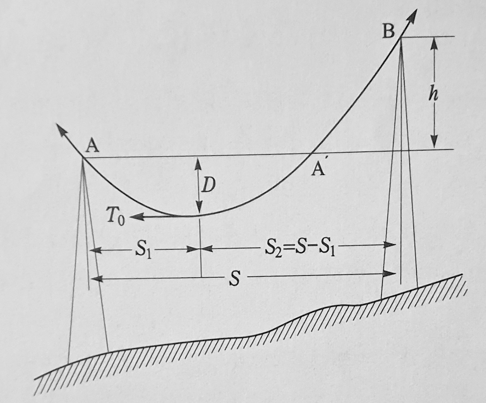 그림 2.5에 보인 것처럼 양 지지점 A, B에 고저차 h [m]이 있을 경우에도 전선이 만드는 곡선은 포물선을 그리게 되고 이것으로부터 경간 길이, 이도 및 전선의 길이를 다음과 같이 구할 수 있다.