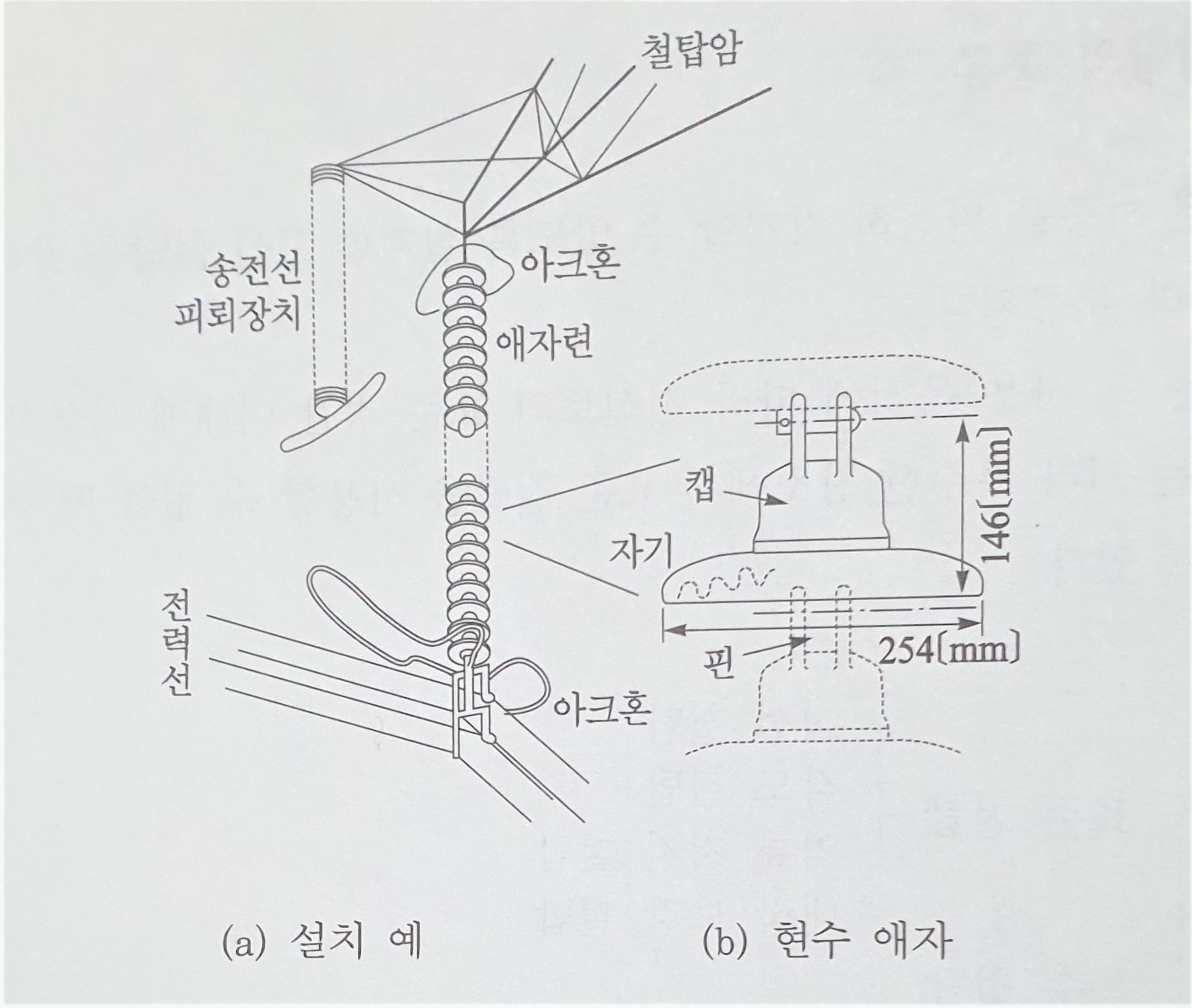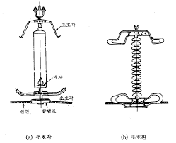 그림 2.15는 이들의 개요를 보인 것인데, 가령 전선이 낙뢰 등으로 애자련에 이상 전압이 생겨서 섬락이 발생하였을 경우 이들 초호환 또는 초호각 사이에서 아크가 직접 연결되어서 자기부에는 아무런 손상을 입히지 않도록 하고 있다.