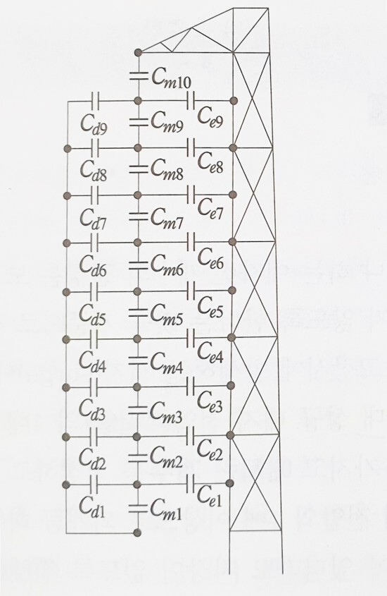애자련의 각 애자에는 자체의 정전 용량 Cm [pF] 외에 애자 금구와 철탑(대지), 금구와 전선과의 사이에 각각 Cₑ[pF] 및 Cd [pF]의 정전용량을 가지고 있으므로 그 등가회로는 그림 2.13처럼 된다.