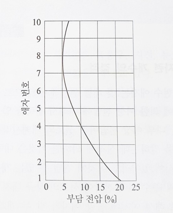 따라서, 각 애자의 전압 분담은 균등하지 않고 그림 2.14에 나타낸 바와 같은 곡선으로 되어 전선에 가장 가까운 애자가 가장 분담비가 크고 중간의 것은 낮고 지지물에 가까운 것은 약간 커지고 있다.