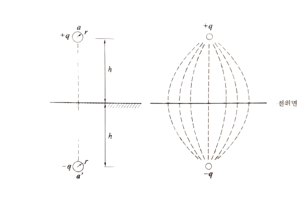 그림 4.21처럼 반지름 r [m]의 무한히 긴 직선 도선 a가 지표면상 h [m]의 높이에 있다. 지금 이것이 +q [C/m]의 전하를 지니고 있다고 하면 도선 a와 대지와의 사이에서의 전기력선의 분포는 대지면이 영전위라고 할 수 있을 경우, 그림 4.21(b)처럼 -q [C/m]의 전하를 가지는 반지름 r [m]의 도선 a'이 지표면 아래 h [m]의 길이에 도선 a와 지표면에 대해서 대칭적으로 존재한다고 생각해서 aa'간에 발생되는 것 중 상반부를 취하면 된다.