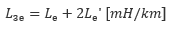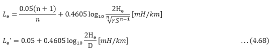 마찬가지로 1선과 대지 귀로의 자기 인덕턴스 Lₑ 및 대지를 귀로로 하는 2선간의 상호 인덕턴스 Lₑ'은 다음과 같이 계산할 수 있다.