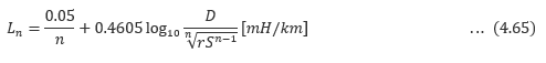 먼저 인덕턴스에 관해서는 소도체의 반지름 r [m], 소도체수를 n, 소도체 간격을 S [m]라고 할 때 도선 내부의 자속 쇄교수에 의한 것은 단도체의 1/n로 되고 등가 반지름은