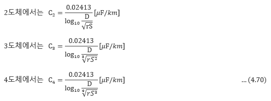 정전용량 계산에 있어서도 등가 반지름 rₑ는 식 (4.64)처럼 구해 가지고 이를 대입해서 구하면 된다. 즉, 작용 정전용량 Cₙ은 아래 식 (4.69), (4.70)과 같다.