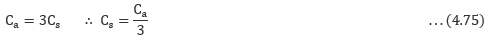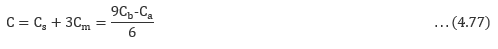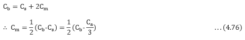 다음 3심 벨트 케이블의 정전 용량은 그림 4.29와 같다고 생각해서 대지 정전용량 Cₛ와 상호 용량 Cₘ 및 작용 용량 C를 다음과 같이 구하고 있다.