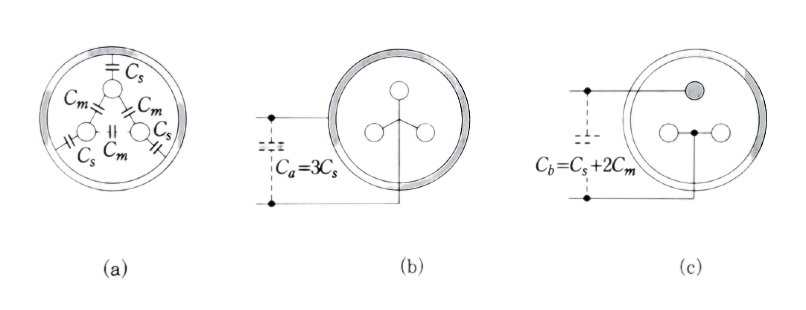 먼저 (b)처럼 3심 일괄 연피 간의 정전용량 Cₐ를 측정하면