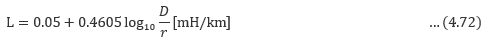 심선 1가닥당의 인덕턴스는 외장 및 연피를 무시하면 가공선의 경우와 마찬가지로 다음식을 써서 계산할 수 있다.