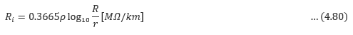 단심 케이블, H지 케이블, SL지 케이블에서는 절연 저항 Ri를 다음과 같은 식을 써서 구하고 있다.