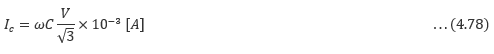 케이블의 충전전류 Ic [A]는 정전용량을 C [μF], 사용전압(선간전압)을 V [kV]라 하면 다음 식으로 표시된다.