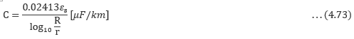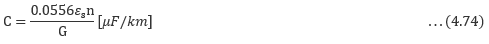정전용량의 개략값은 C = 0.3~1.7 [μF/km]의 범위이다.